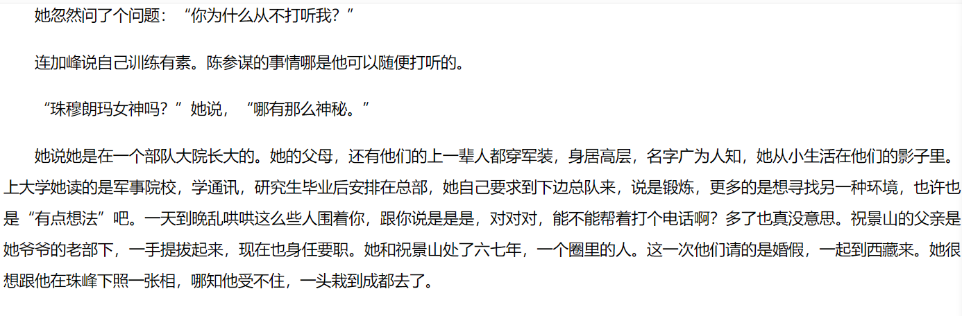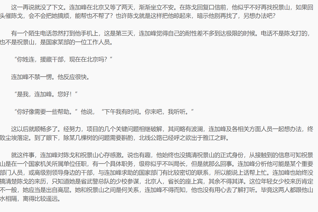 具體小説情節,就不過多劇透了,反正是一開始祝局長不想去,所以讓連加峯想個辦法誆騙陳戈,對祝景山這種人來説,生活就是這麼四平八穩,一步一步要走得穩穩當當,踏踏實實,11月深秋跑去看世界第一峯,來回奔波幾千裏,至於嗎?