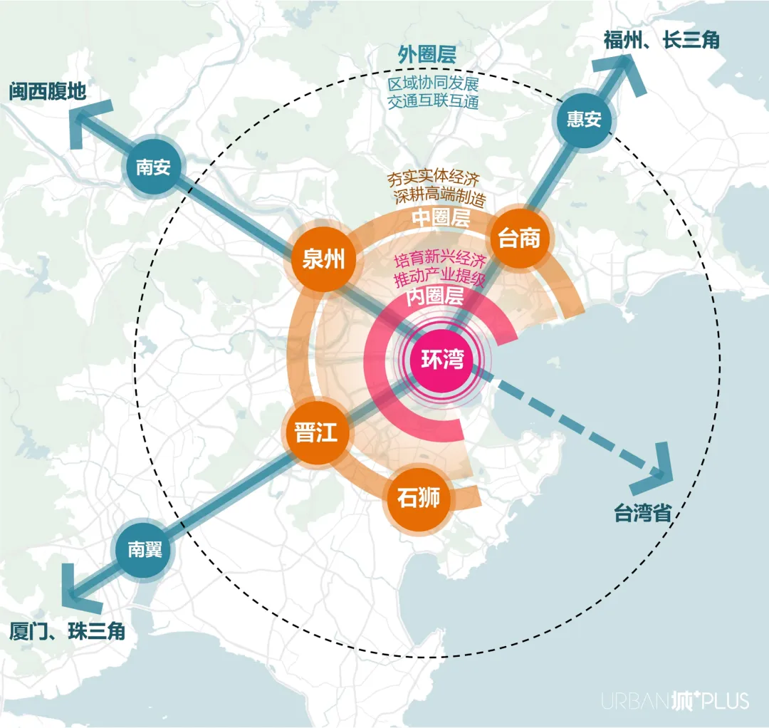而對比他所點明的兩個重點培育的中心,也是泉州的重點所在。據劉寶龍所述,泉州正在構建三大圈層,東海、晉東兩個中央活力區均位於“內圈層”,目的在於“把外溢的生活、生產服務型的功能拉回來”,同時構建服務於本地、對外有影響力的中心體系。