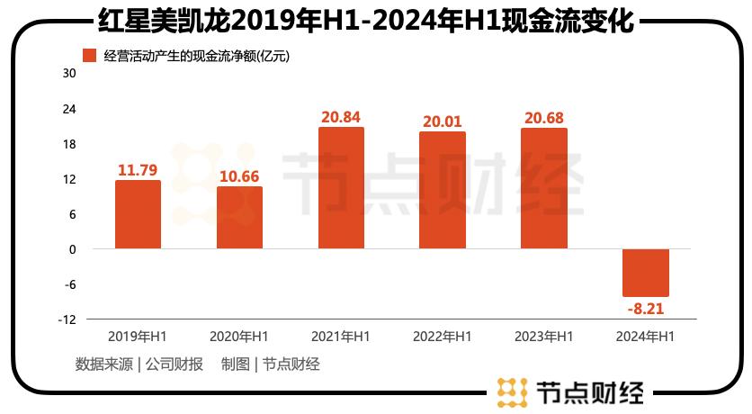 從最基本的現金流觀察,今年半年報顯示,**紅星美凱龍經營現金流淨額為負8.21億元,同比下滑139.71%。**更進一步來看,在2024年之前的很多年,紅星美凱龍現金流都極少出現負值的情況。所以,當前的情況在某種程度上也説明,公司的自身造血能力已經嚴重受損。