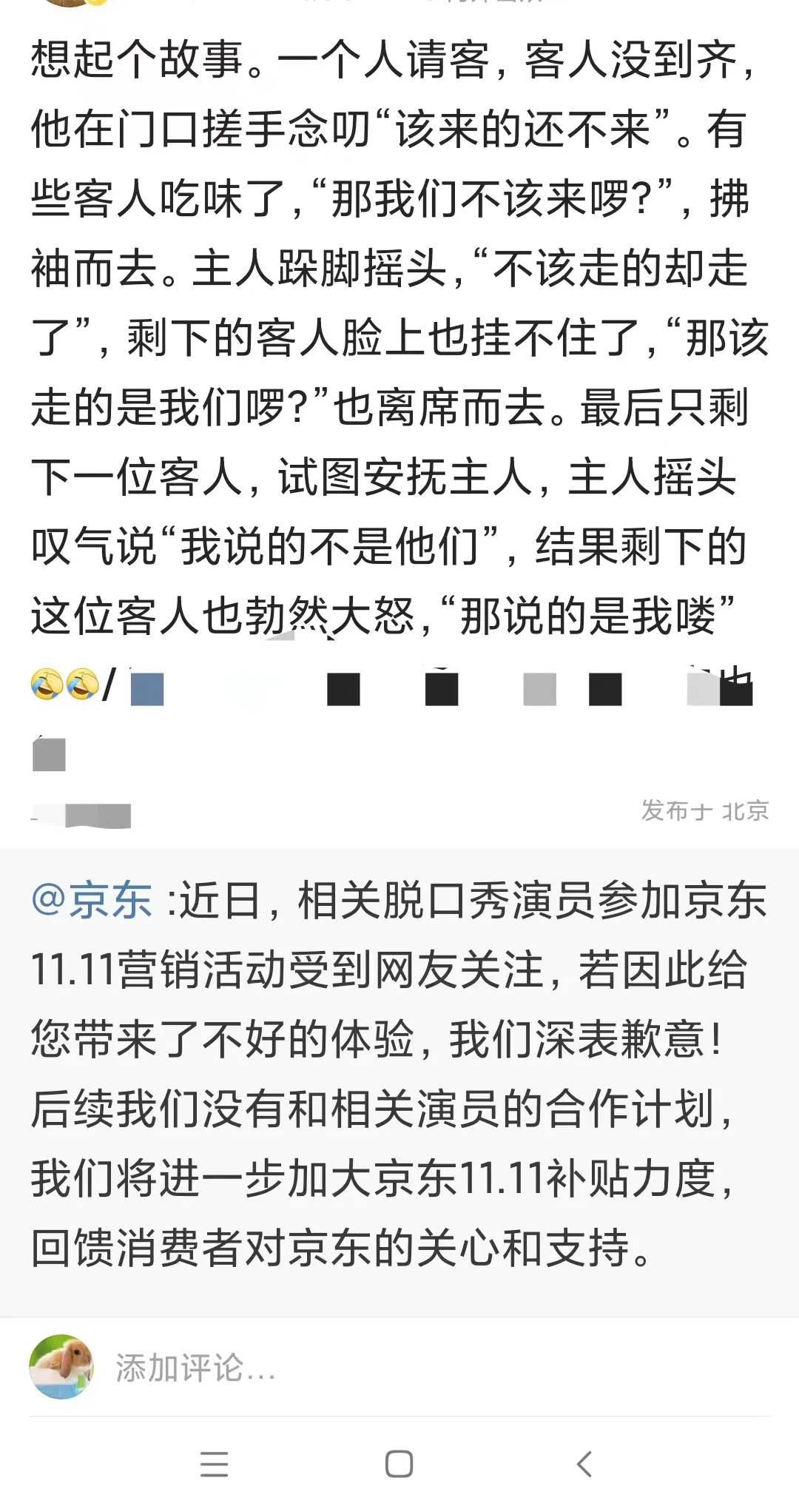 結果事兒真出了,京東真慫了,又發公告説暫停 脱口秀合作,以後都不再合作。