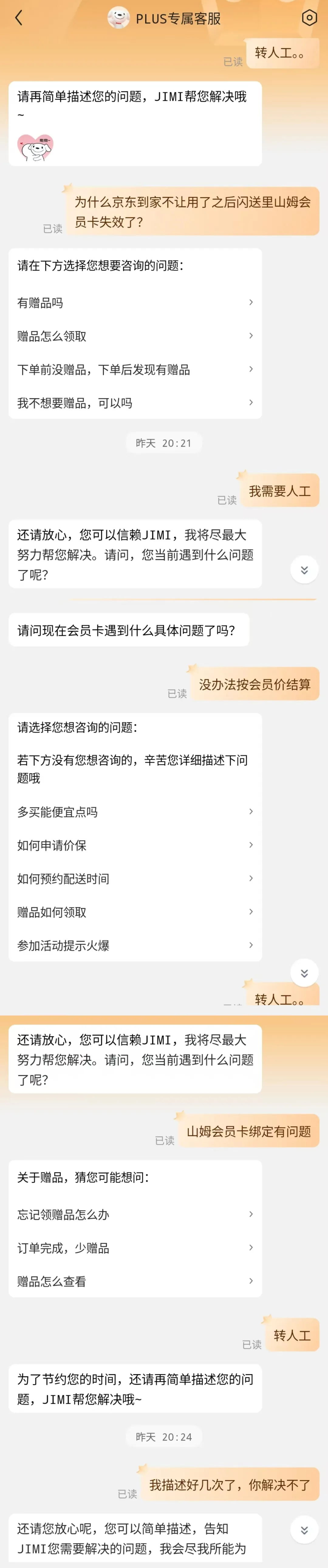 結果滿屏自動回覆裏輸入轉人工,卻沒有辦法像往常一樣跳轉,要麼是因為後台諮詢的人太多,要麼,是因為他在開頭提了會員卡,被後台自動識別屏蔽了人工服務,而京東前幾天剛剛決定不再對京東plus會員予以退款。