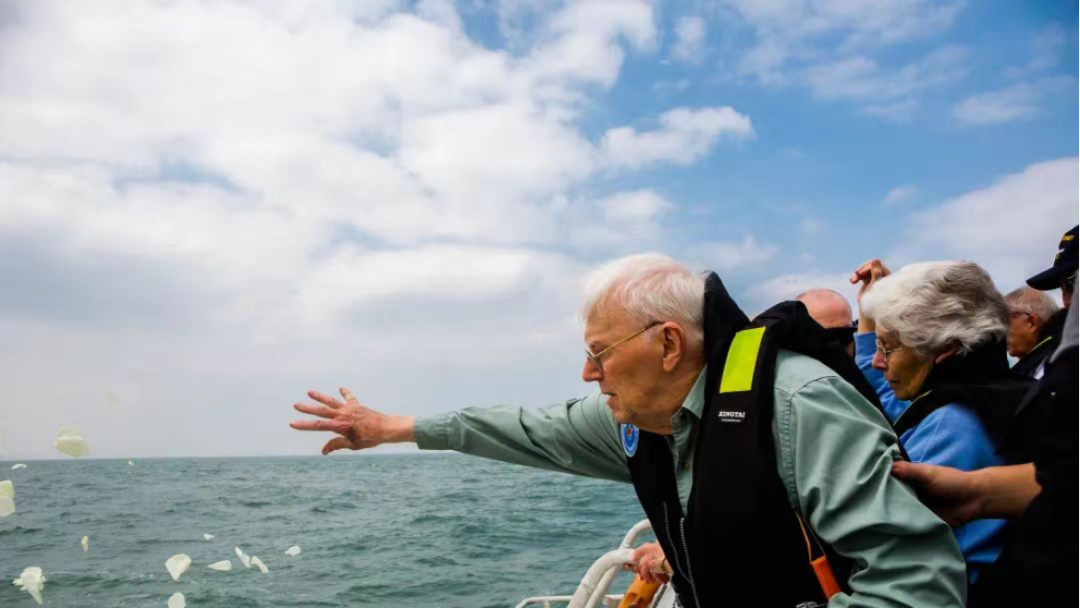 方勵先帶老人們在岸邊悼念,之後老人們被邀請上船,前往裏斯本丸沉船的海域。
