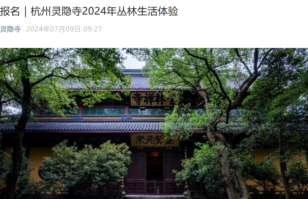 今年7月,杭州靈隱寺發佈文章,招募“叢林生活體驗活動”:為期七天,全程免費,報名者要求身體健康、尊重佛法、保證不缺席,還有很重要的一條——上繳手機。