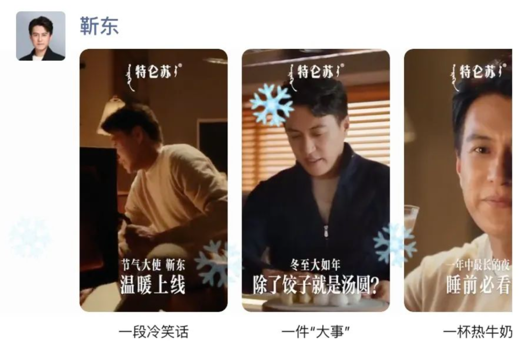 倪妮在你的朋友圈中,鏡頭翻轉間完成了自拍、大片拍攝等多個場景任務,把華為Pura 70鏡頭賣點融入進去;靳東在朋友圈給你講笑話,冬至温馨畫面上飄着小雪花,特侖蘇悄悄植入…