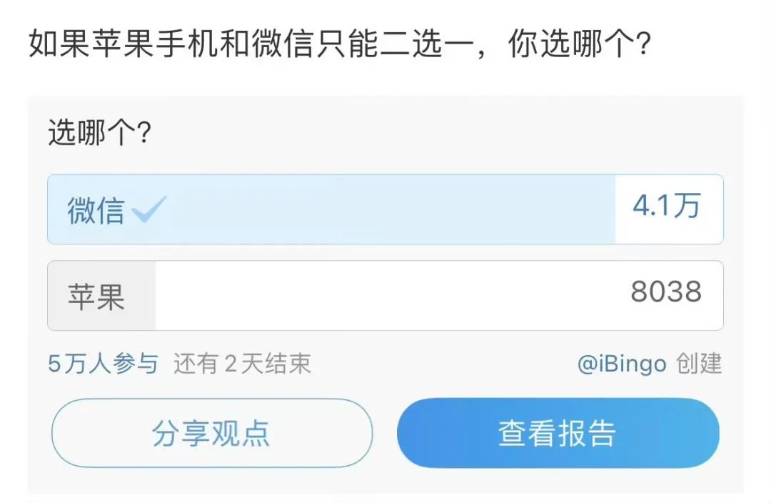 硬幣的反面是,前段時間因為app支付抽成的問題,微博曾發起了一項“微信VS蘋果二選一的投票”,有超過10萬人參加了一項投票:其中84%的人表示,如果蘋果手機和微信只能二選一,那自己會選擇微信。