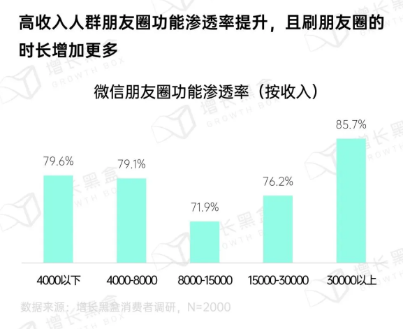 這次報告還有個數據非常強悍,月收入在30000以上的人羣微信朋友圈功能滲透率最高,有85%的消費者表示自己會每天使用微信朋友圈功能,並且這部分人羣刷朋友圈的時長增加比例也最高。