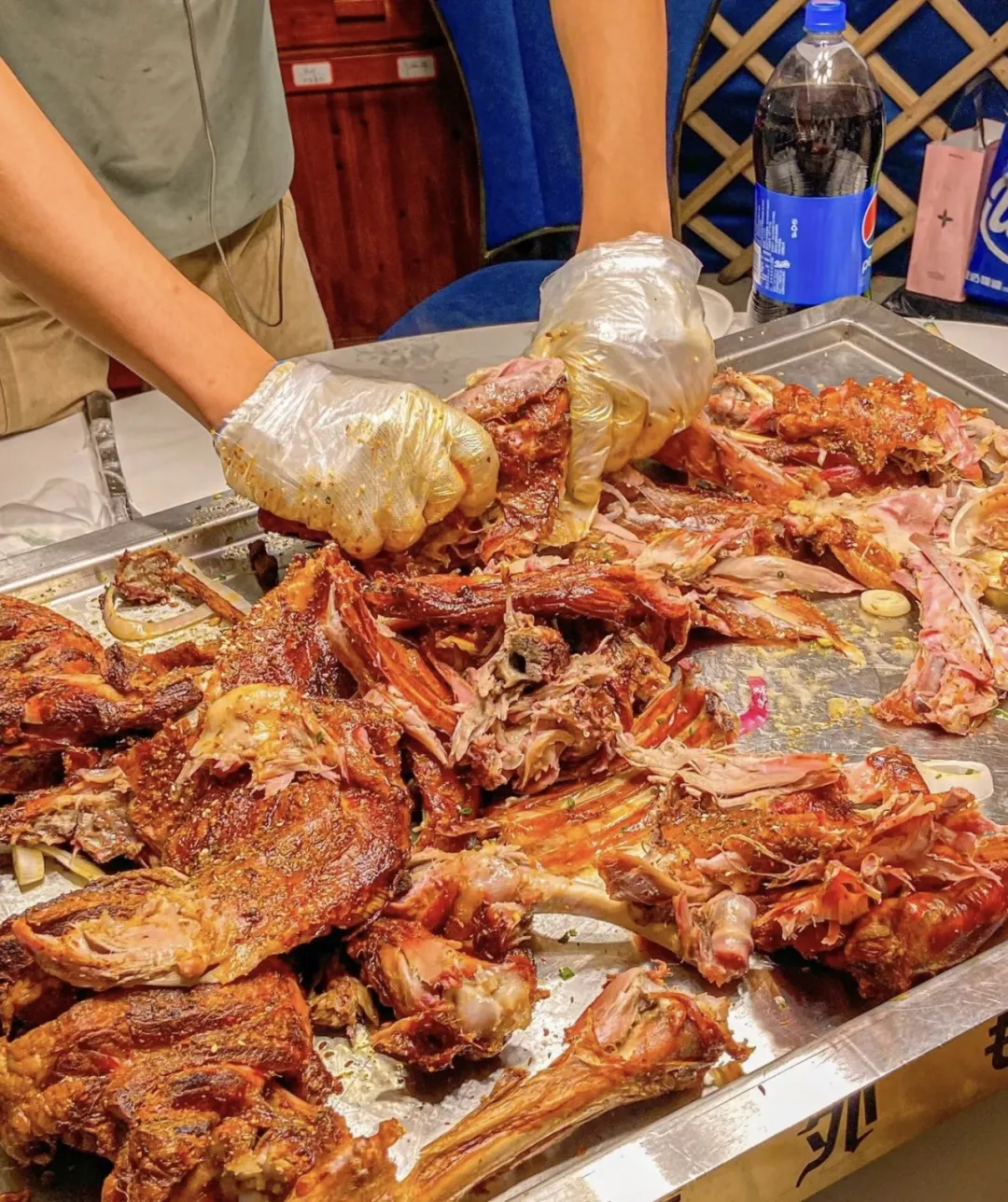 烤全羊肉外皮酥脆,咬一口“咔滋”作響,裏面的肉質鮮嫩多汁,香嫩可口,肥而不膩。味道鮮、香、鹹,各種味道相互交融,讓人回味無窮。
