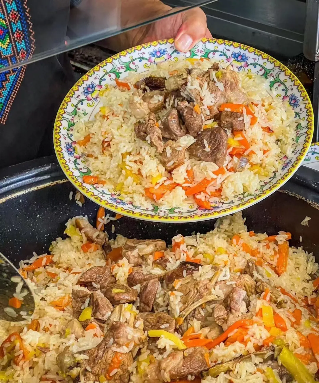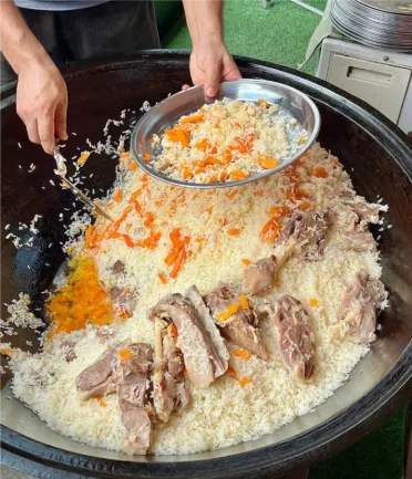 手抓飯色澤金黃,羊肉和胡蘿蔔的顏色相互映襯,葡萄乾的點綴使其更加美觀。米飯軟糯,羊肉鮮嫩,胡蘿蔔甜脆,葡萄乾的酸甜口感為手抓飯增添了豐富的層次。