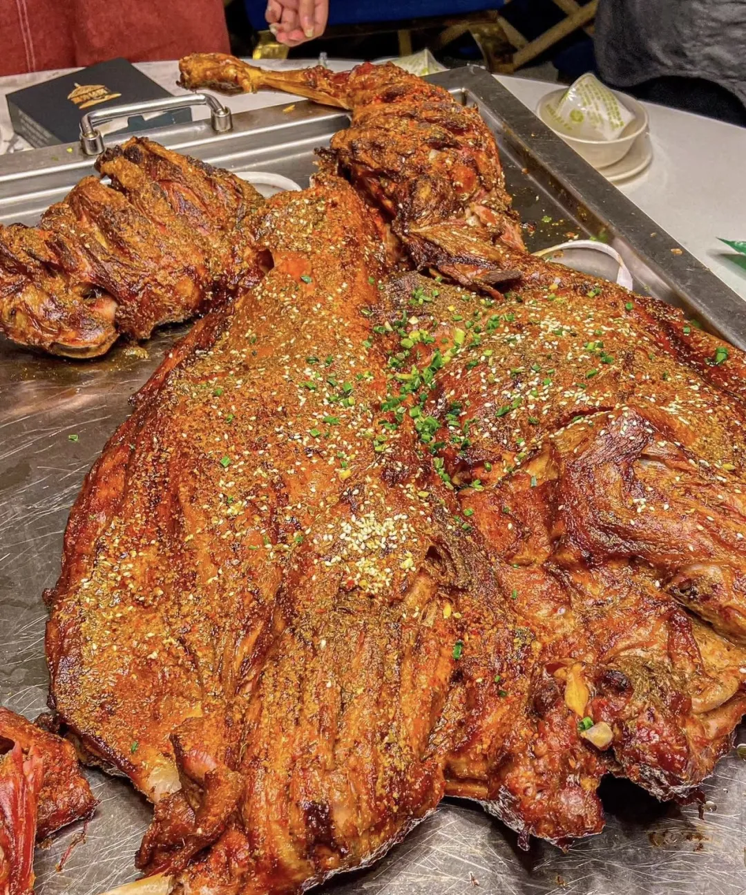 烤好的全羊色澤黃亮,猶如披上了一層金色的外衣,在燈光或陽光下熠熠生輝,極具視覺吸引力。