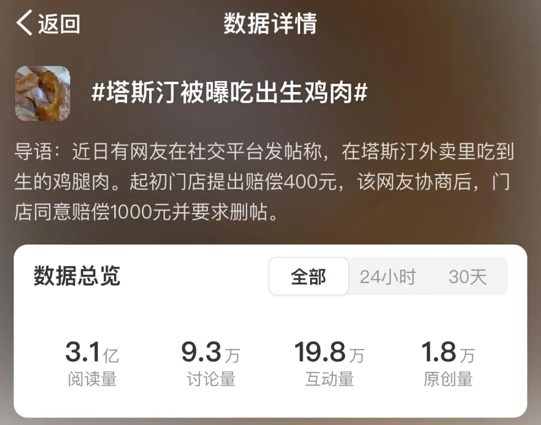 根據餐裏眼數據顯示,截至2024年8月底,塔斯汀新開門店數量約為1300家,其中包含部分已簽約門店,月均開店速度約為160家,相較於去年同期,塔斯汀拓店速度明顯放緩。雪上加霜的是,“塔斯汀被爆吃出生雞肉”等食安爭議大大降低了大眾對於塔斯汀的信任度。