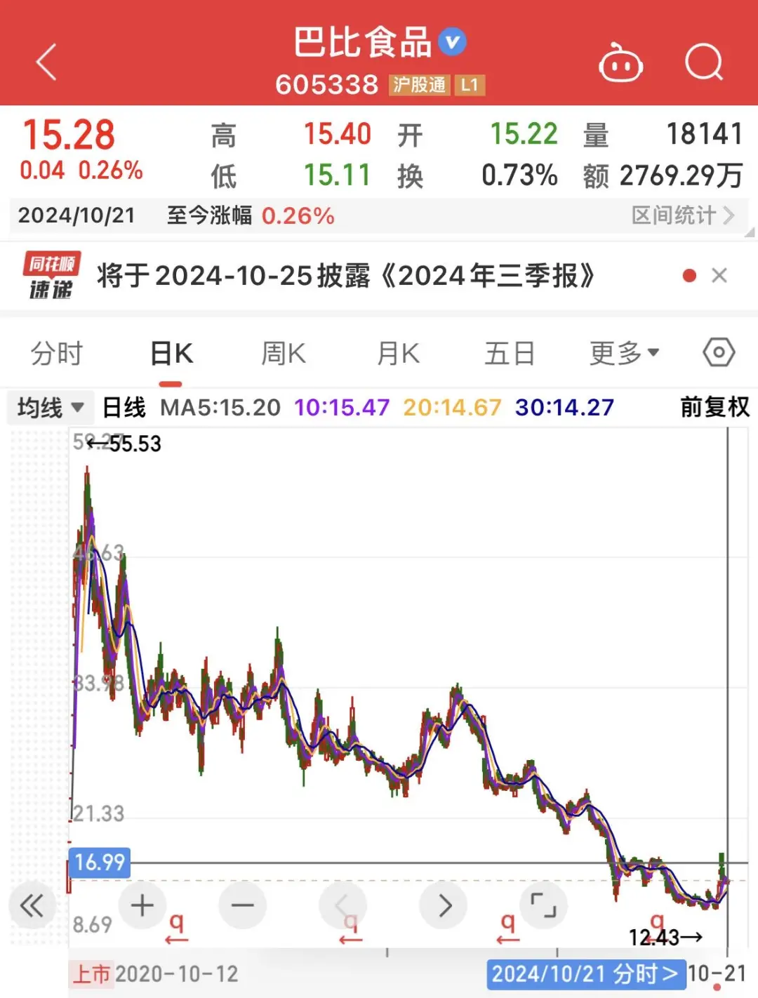2020年10月12日,巴比饅頭母公司中飲巴比食品股份有限公司在上交所A股主板掛牌上市,股票簡稱“巴比食品”,上市首日其股價上漲44.03%,上市8天連續摘得8個漲停板。2024 年上半年,巴比饅頭實現營業收入 7.64 億元,同比增長 3.56%,增速並不明顯。在二級市場表現上,相較於2020年最高點55.53元/股的價格,巴比食品的股價已跌去近7成,近半年來都在17元/股的價格帶左右徘徊。