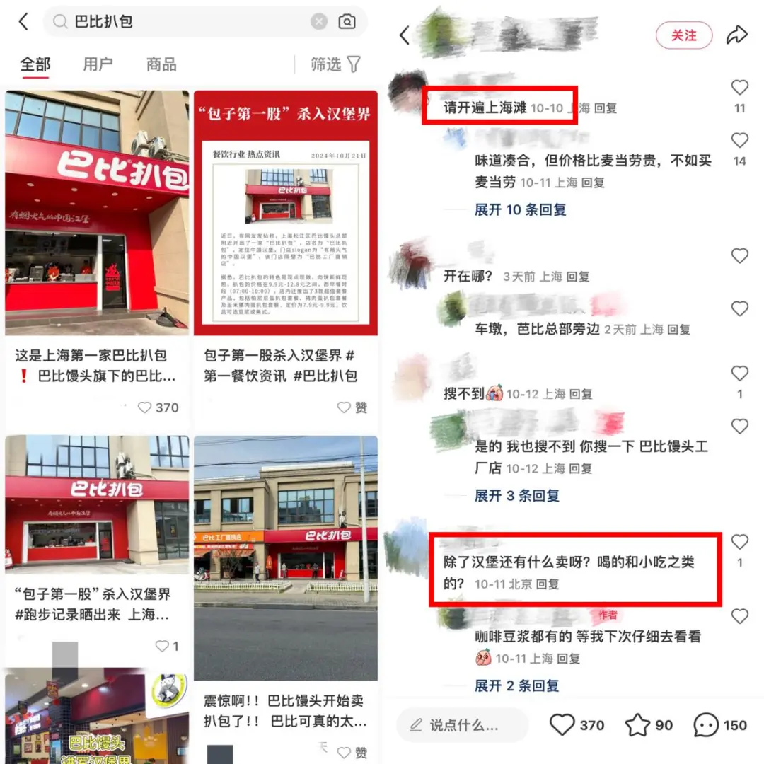 與此前開巴比饅頭店鋪選址都在人流量大的繁華地段不同,巴比扒包位置在巴比饅頭總部附近,旁邊就是巴比饅頭的工廠直銷店和巴比旗下的日日鮮麪食館,客流也相對較少,且顧客大多選擇外帶。在社交平台上,巴比扒包也暫未有較大聲量,不過已有部分用户表示好奇想去嚐嚐。