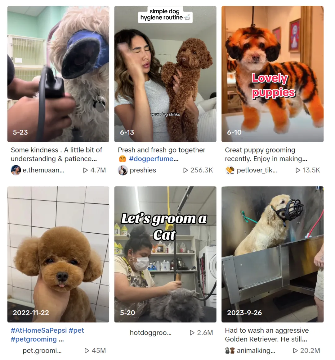 這一被國內商家親切稱為“寵物洗剪吹”的全新品類,最常出現在TikTok裏的“寵物美容”(pet grooming)標籤裏。刺蝟公社經過搜索後發現,目前該標籤已有超12億的瀏覽量。