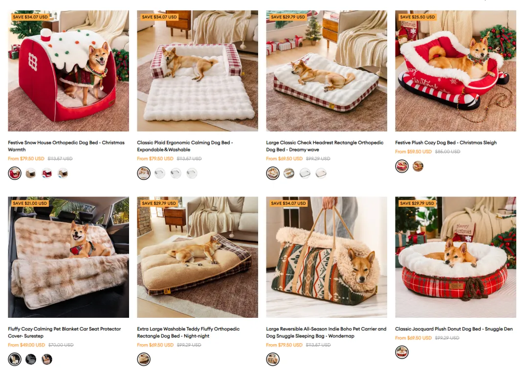 FunnyFuzzy瞄準的細分賽道是“寵物紡織產品”,包括狗牀、狗墊、牽引繩等等,聽起來沒什麼特別的,但是看過就會發現,FunnyFuzzy十分注重產品設計,會在萬聖節、聖誕節即將到來之際,設計相關主題的產品外觀。與此同時,FunnyFuzzy對於寵物出行所必需的寵物手提袋、寵物揹包、寵物車用座椅等品類也有所涉獵。
