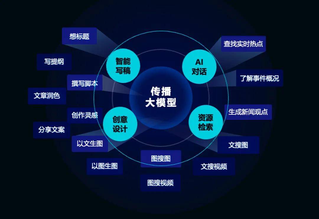 除了整合宣傳資源形成媒體資源庫、內容自動審核、稿件即時鏈接至傳播矩陣平台等“提效”工具,傳播大腦不斷向新技術要生產力。直接的例子就是2023年9月上線的“傳播大模型”,陸續推出了對話問答、智能創作、多模態檢索、創意設計、智能審校等60餘項AIGC功能,並已經面向“一張網”用户開放使用。