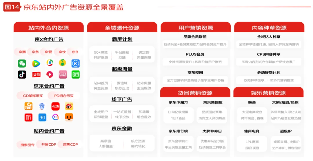 **為更全面地觸達用户,圍繞着用户購買商品的路徑,京準通實現廣告資源的全景覆蓋,整合優質的媒介矩陣。**從站內外地合約資源、全域曝光資源、用户營銷資源、貨品營銷資源、內容種草資源、娛樂營銷資源。