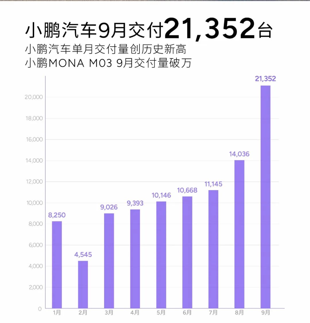 小鵬MONA官方在“關愛計劃”中也有提及,由於訂單數量的持續增長,9月通過兩次擴產實現了交付量超萬台的歷史新高。