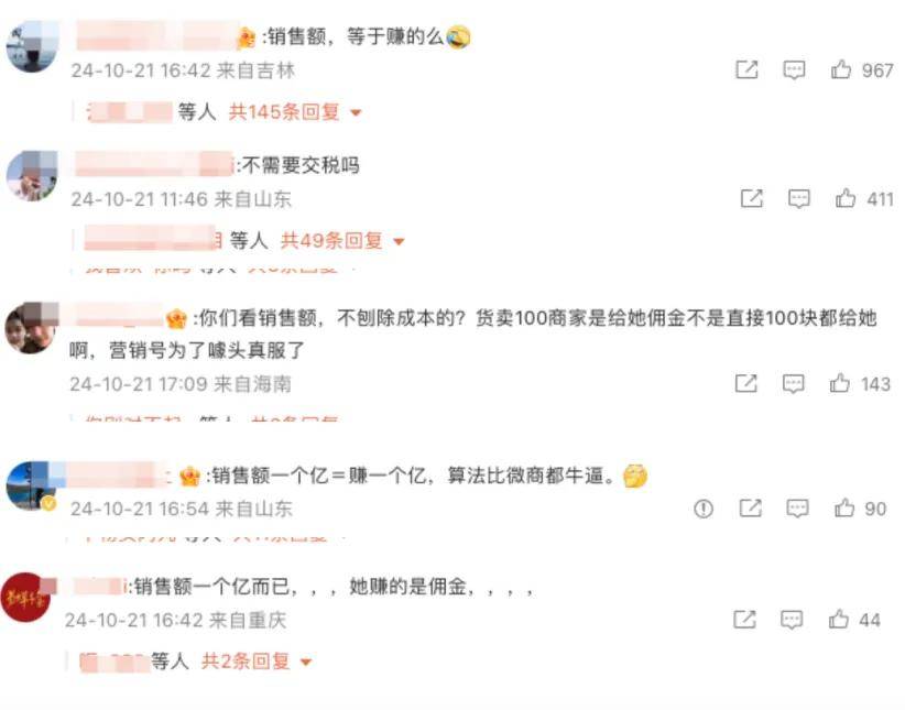 小柴點開評論區畫風是這樣的,有人質疑,銷售額怎麼能説人家賺了,你明明知道,帶貨主播賺的是佣金,賣了一個億的貨,不是指主播就賺了一個億,你這算法比微商都牛逼!