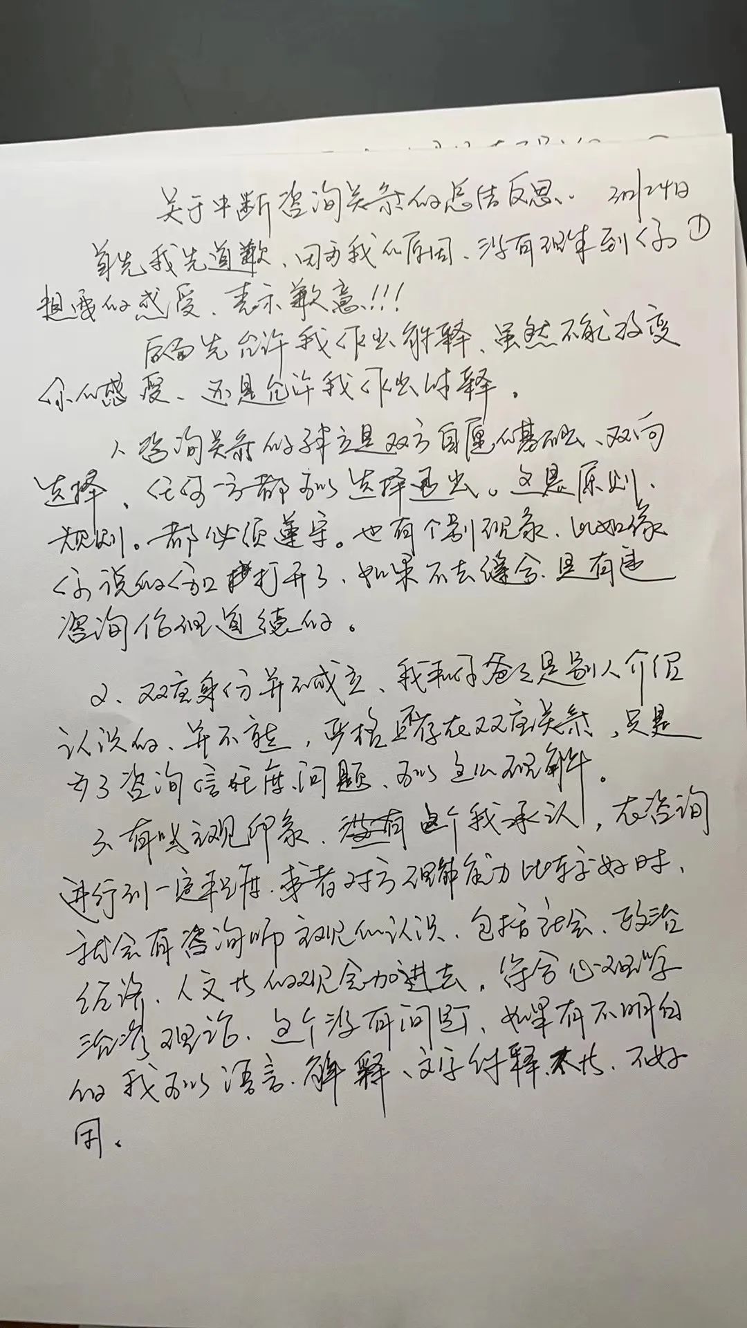他回覆了我長長的語音,還發來手寫內容,説在我這件事上付出了很多心血,自己可以非常專業地解決問題,如果中斷諮詢,過去的付出都付諸東流了。
