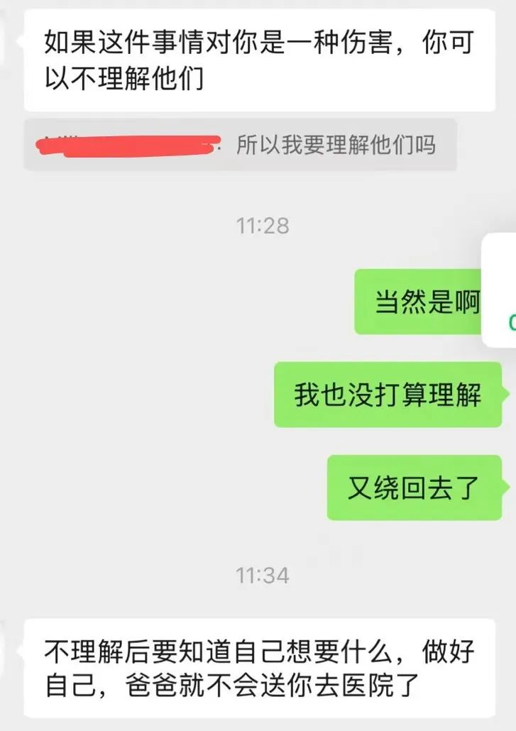 我急切需要心理諮詢師的安慰,對方給我的回覆卻是:“做好自己,爸爸就不會送你去醫院了。”