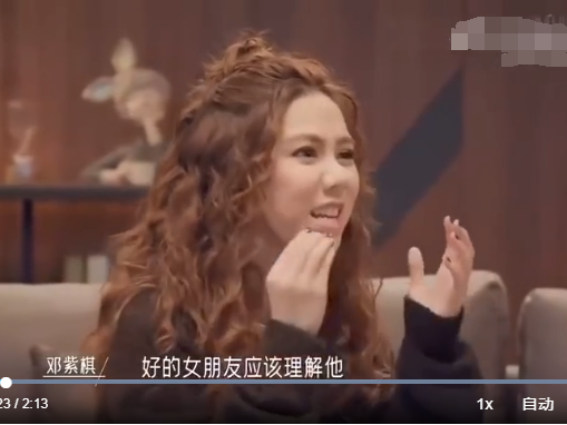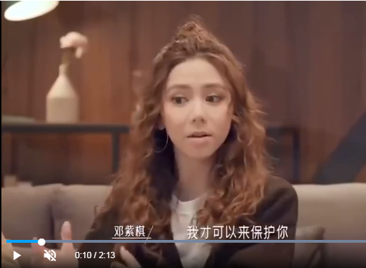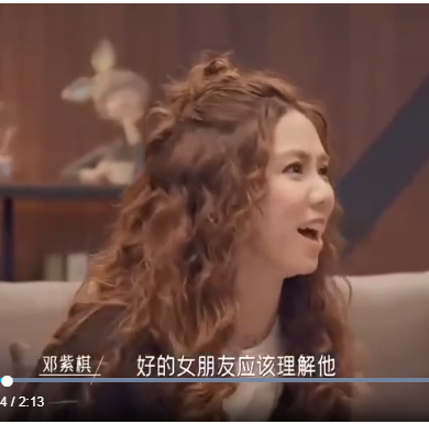 第2張圖,可能是看了男女戀人的吵架衝突(聊天的背景事件),鄧紫棋説出了她的想法:男生跟女生的想法不一樣。女生通過男生征服(獲取)這個世界(的物質條件),男生先征服(獲取)這個世界(的物質條件),才可以保護這個女生。鄧紫棋在陳述觀點的時候,她身體端坐,表情略帶嚴肅,語氣堅定,説明她很認真地闡明自己觀點(因為了解男女衝突的癥結)。
