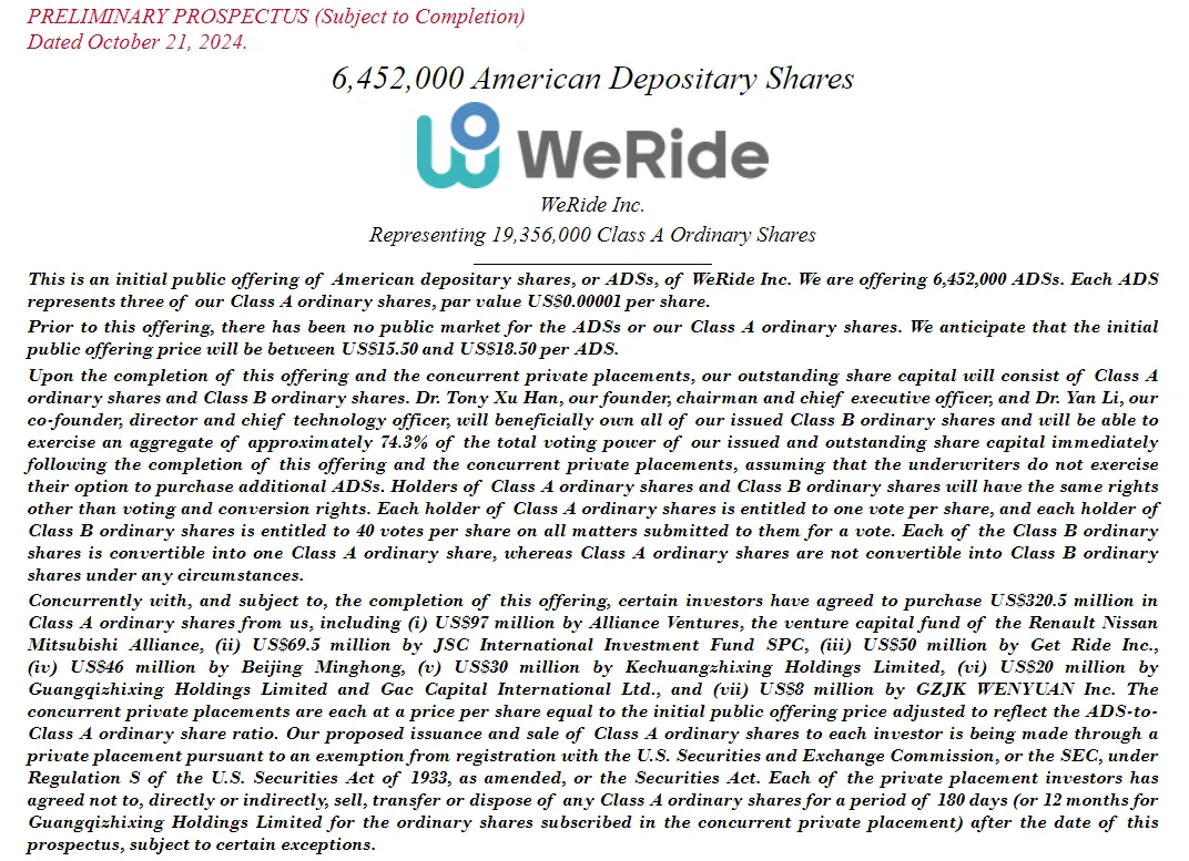 文遠知行WeRide(WRD)更新美股IPO招股書,並啓動招股。文遠知行擬在納斯達克掛牌上市,IPO的主承銷商為摩根士丹利、摩根大通和中金公司。基於最新更新後招股書,文遠知行發行區間為15.5美元至18.5美元,發行645.2萬股ADS,籌得資金淨額中值約為9,600萬美元。與本次發行同時並須待本次發行完成後,某些投資者已同意從文遠知行這裏購買價值3.205億美元的A類普通股。其中:雷諾日產三菱聯盟的風險投資基金Alliance Ventures購買9700萬美元,JSC International Investment Fund SPC購買6950萬美元,Get Ride購買5000萬美元,Beijing Minghong購買4600萬美元,Kechuangzhixing購買3000萬美元,Guangqizhixing和Gac Capital International購買2000萬美元,GZJK WENYUAN 購買800萬美元。Robert Bosch GmbH有意購買總計高達1億美元的ADS。據此發行方案,文遠知行本次IPO最高募資有望超過4億美元,最高估值約50億美元。