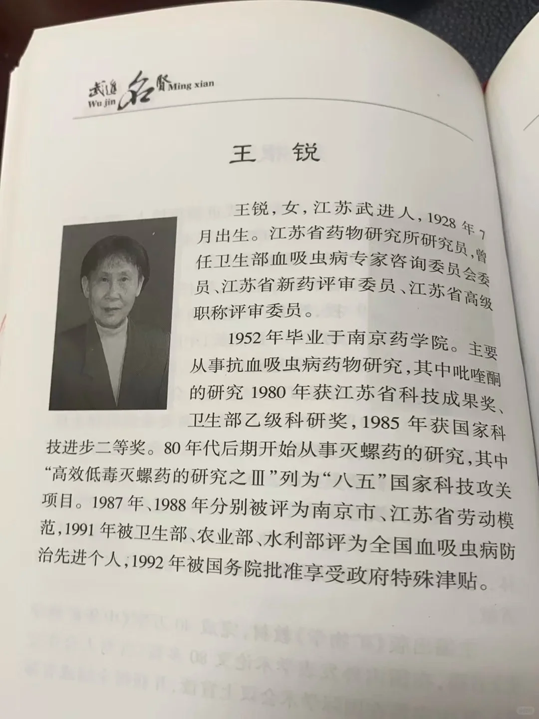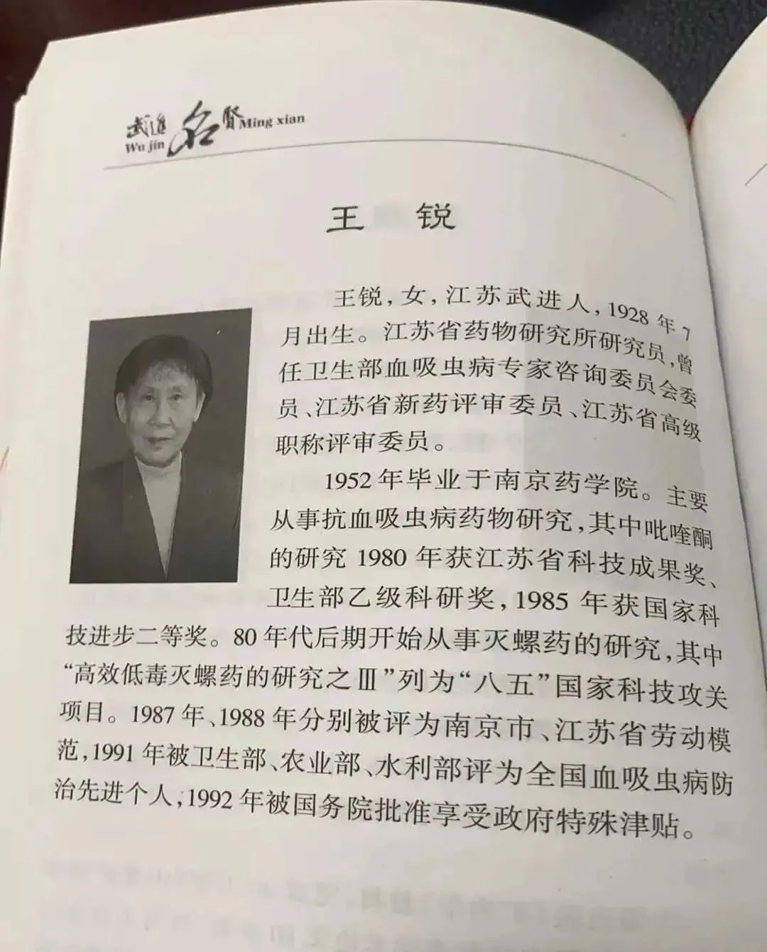 王鋭,出生於1928年,江蘇武進人。她是江蘇省藥物研究所的研究員,曾為我國血吸蟲病防治事業貢獻了畢生精力。