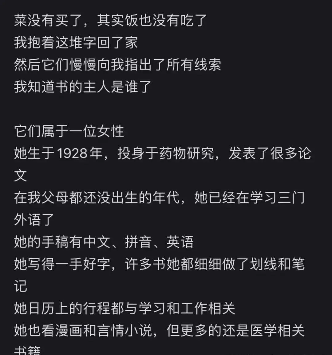10月21日,有網友在社交平台發帖,內容講述了她在廢品站偶然購得幾本舊書和手稿,意外拼湊出一位已故女科學家的人生片段。