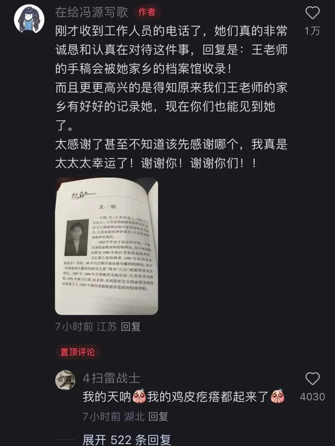 有人通過手稿中的科研成果和教育背景,聯繫到了王鋭在血吸蟲病研究領域的巨大貢獻;