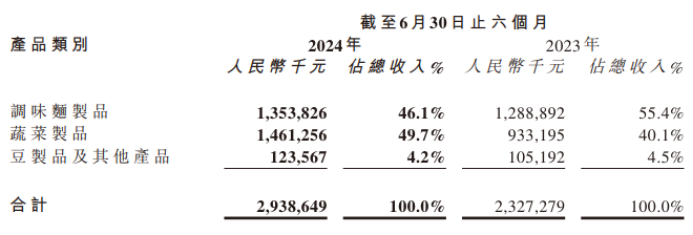 財報顯示,2021年-2023年,衞龍美味蔬菜製品營收分別為16.64億元、16.93億元、21.19億元,分別同比增長42.5%、1.8%、25.1%。2024年上半年,衞龍美味蔬菜製品營收14.61億元,同比增長56.59%,營收佔比高達49.7%,超越調味面製品業務,成為公司第一大營收支柱。