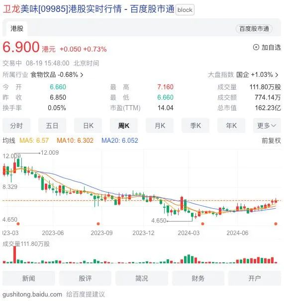 **邊緣化辣條業務博取亮眼業績的舉措,並未讓資本市場高看衞龍美味。**目前,衞龍美味的股價僅為6.9港元/股,相較2023年初12.14港元/股的歷史高點下跌43.16%,近乎腰斬。