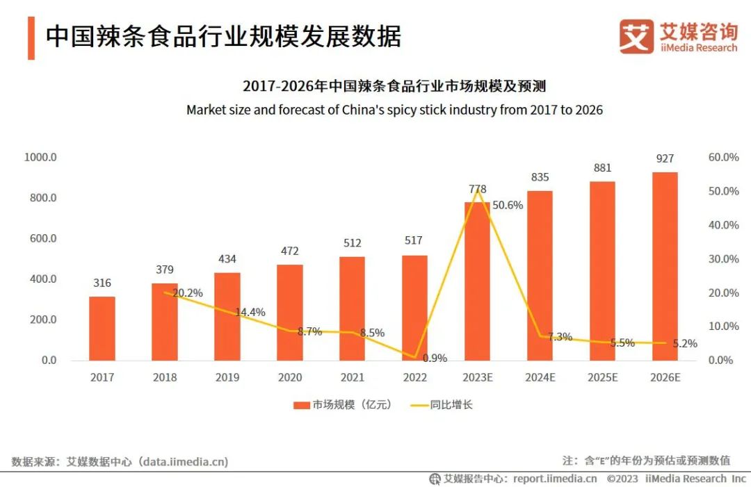 對比而言,高鹽、高油、高熱量的辣條背離了消費者健康飲食的需求,自然難逃銷量走低的宿命。艾媒諮詢披露的數據顯示,預計2024年-2026年,中國辣條食品市場規模同比增速均為個位數,相較此前幾年的雙位數增速,大幅回落。