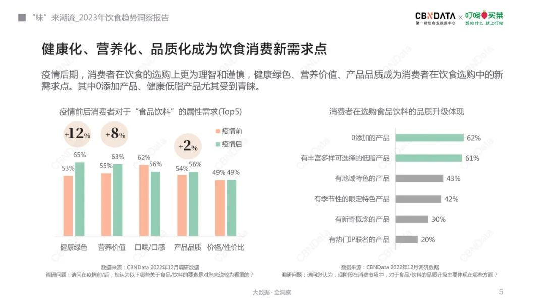 衞龍美味的調味面製品市場影響力之所以觸及瓶頸,很大程度上都是因為下游消費市場需求生變。近年來,隨着居民收入水平提升,消費者在飲食需求上出現了消費升級趨勢。CBNData披露的《2023年飲食趨勢洞察報告》顯示,“健康化、營養化、品質化成為飲食消費新需求點”。