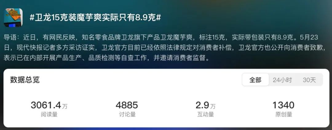 隨後,話題“衞龍15克裝魔芋爽實際只有8.9克”登陸微博熱搜榜,收穫超3000萬閲讀量。諸多網友紛紛表示,“衞龍又貴又難吃”“ 這麼貴還缺斤少兩,真是黑心商家”。