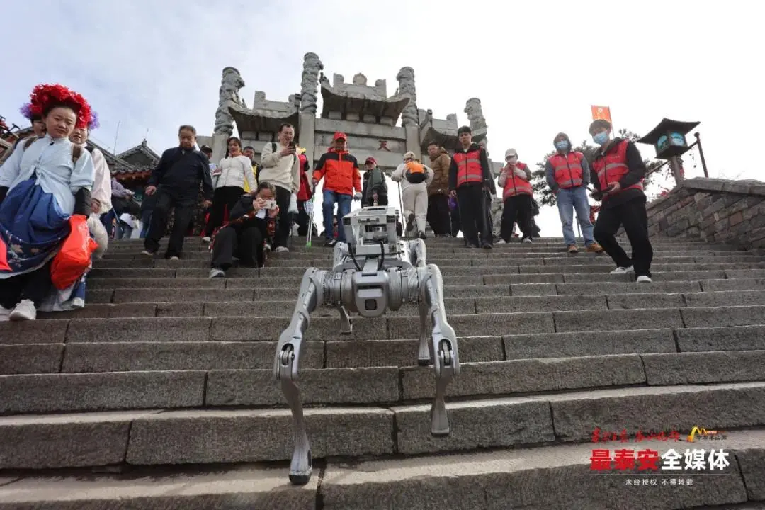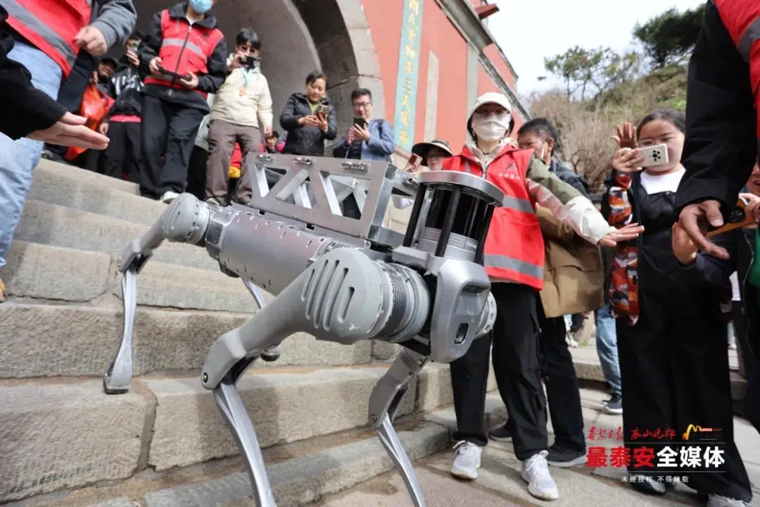 三天的測試中,機器狗不僅以其穩健的步伐和卓越的性能征服了泰山盤道,還意外成了一道獨特的風景線,為大家的登山之旅增添了樂趣。登泰山的遊客在看到機器狗時紛紛停下腳步,拿出手機拍照、錄像、合影,記錄下這一登山途中遇到的場景。