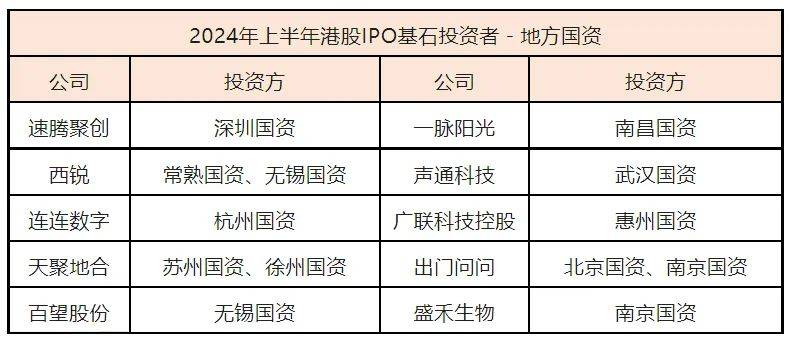 如果再將時間線拉長,過去一年,港股新上市的70多家公司中有近30家是由地方政府出資平台擔當基石投資人。從投資額看,2022年國資佔比19.7%,2023年佔比29.8%,2024年上半年,國資比例就超過了58%。特別是包括出門問問、西鋭、天聚地合等企業IPO時,均有同時引入超過2家地方國資作為基石投資人。