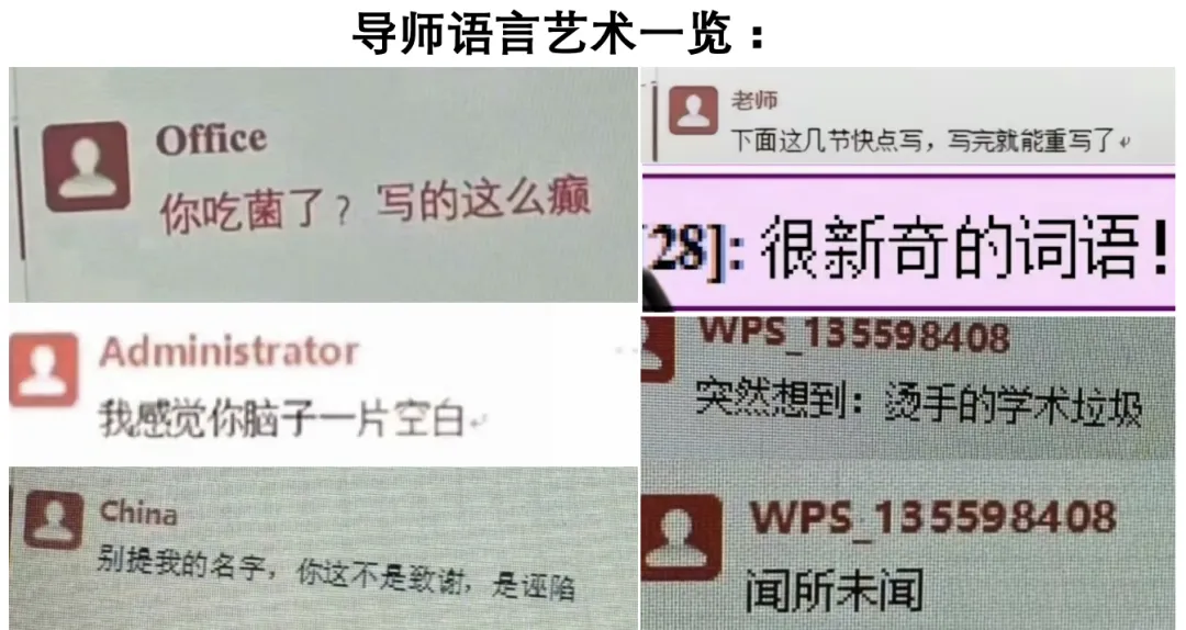 他們師者仁心,理解學生的壓力,也實在對垃圾內容看不過去,只能通過發朋友圈吐槽、舞大棒等排解壓力。心裏苦成苦瓜,也不敢斥責,只會旁敲側擊苦苦哀求:要不咱今天再改改論文吧?