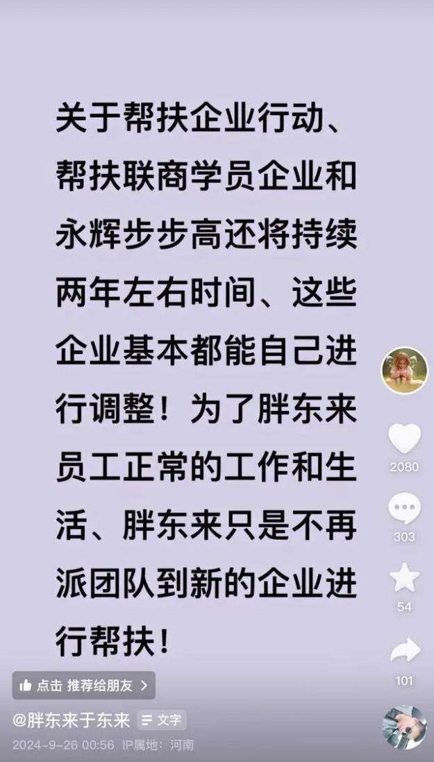 對此,於東來9月26日在抖音賬號上曾作出回應稱,關於幫扶企業行動、幫扶聯商學員企業和永輝、步步高還將持續兩年左右時間,這些企業基本能自己進行調整!為了胖東來員工正常的工作和生活、胖東來只是不再派團隊到新的企業進行幫扶!
