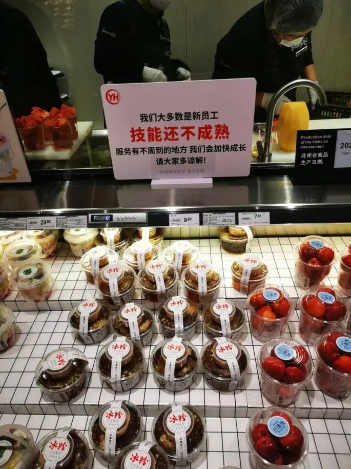 很多來到喜隆多永輝的顧客,其實是帶着“胖東來”的濾鏡的。**為了不讓慕名而來的顧客產生太大的落差,在超市內醒目的位置,都提前做了提示。**比如“我們大多數是新員工,技能還不成熟,服務有不周到的地方,我們會加快成長。”這樣的提示讓人感覺非常有誠意,更容易獲得顧客的寬容。