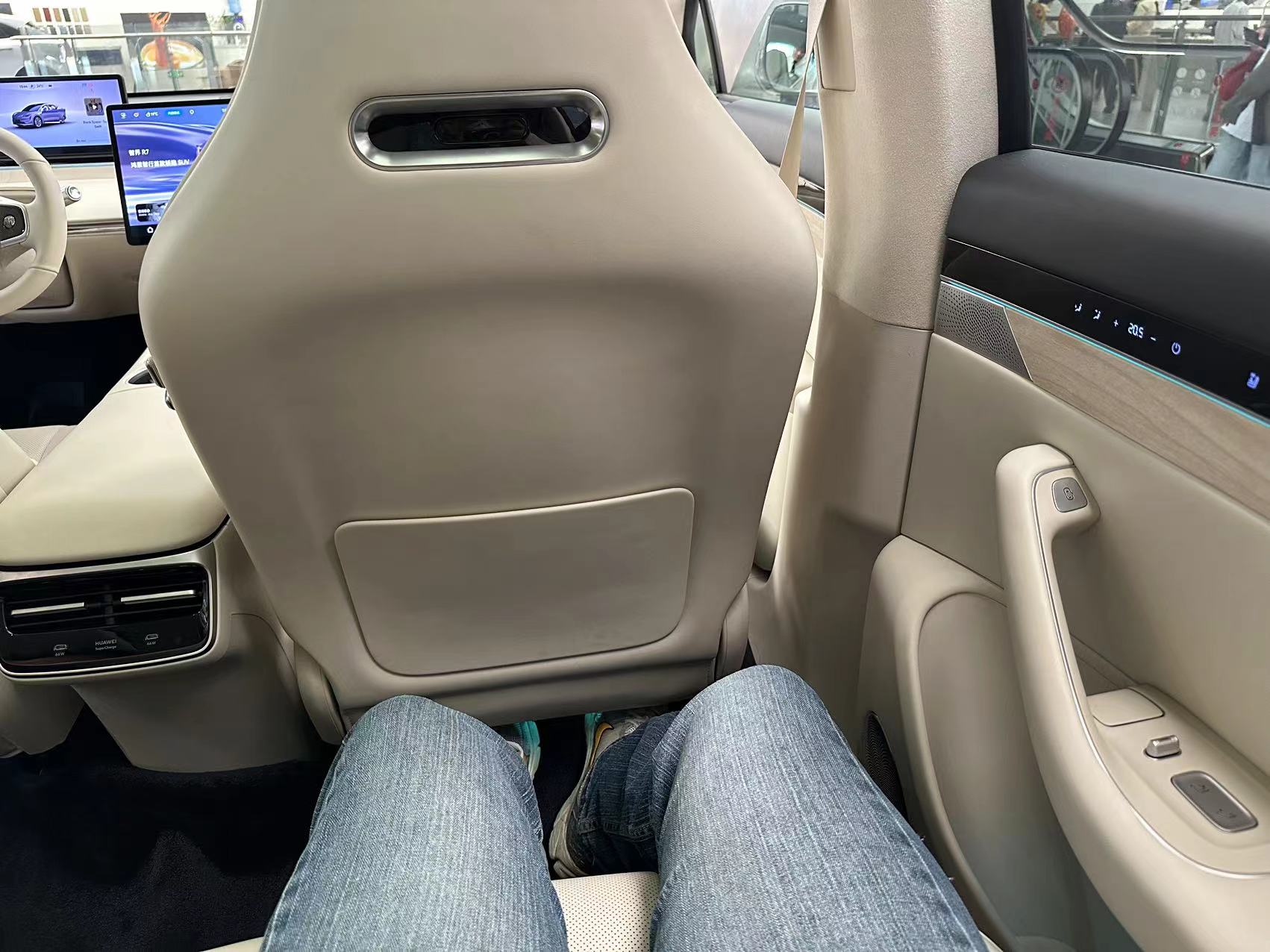 後排空間給人體驗還不錯,腿部空間充足椅面支撐很足。而且後排座椅角度可調,舒適性還不錯。夫人最滿意的是後排車門上的一排控制按鍵,她非常喜歡這一設計表示方便了後排控制空調。後排座椅的接口有生態應用可以插入平板,如果是華為平板則可以與車機屏幕進行聯動,也算是全套homo生態了。