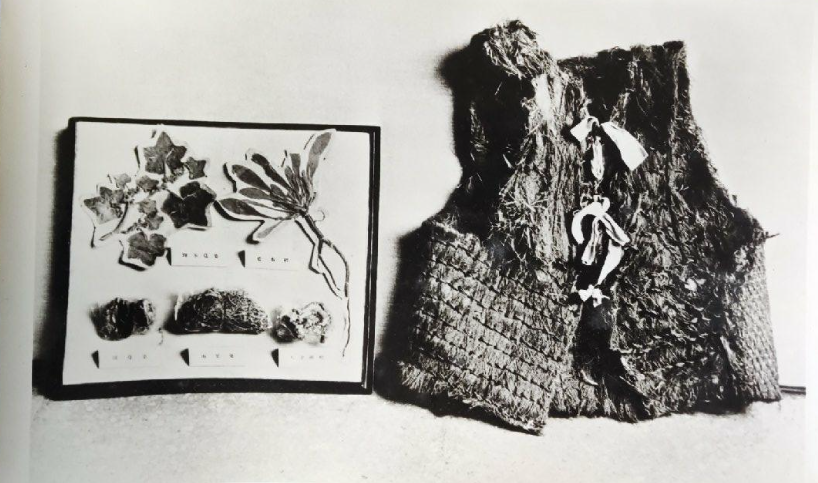左圖為紅軍長征過草地時吃過的野菜標本,右圖為長征時期紅軍戰士自制的棕衣褂子