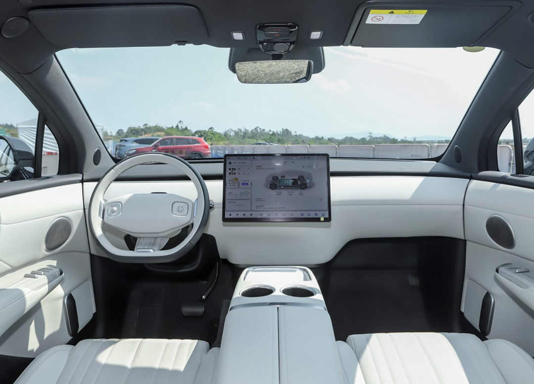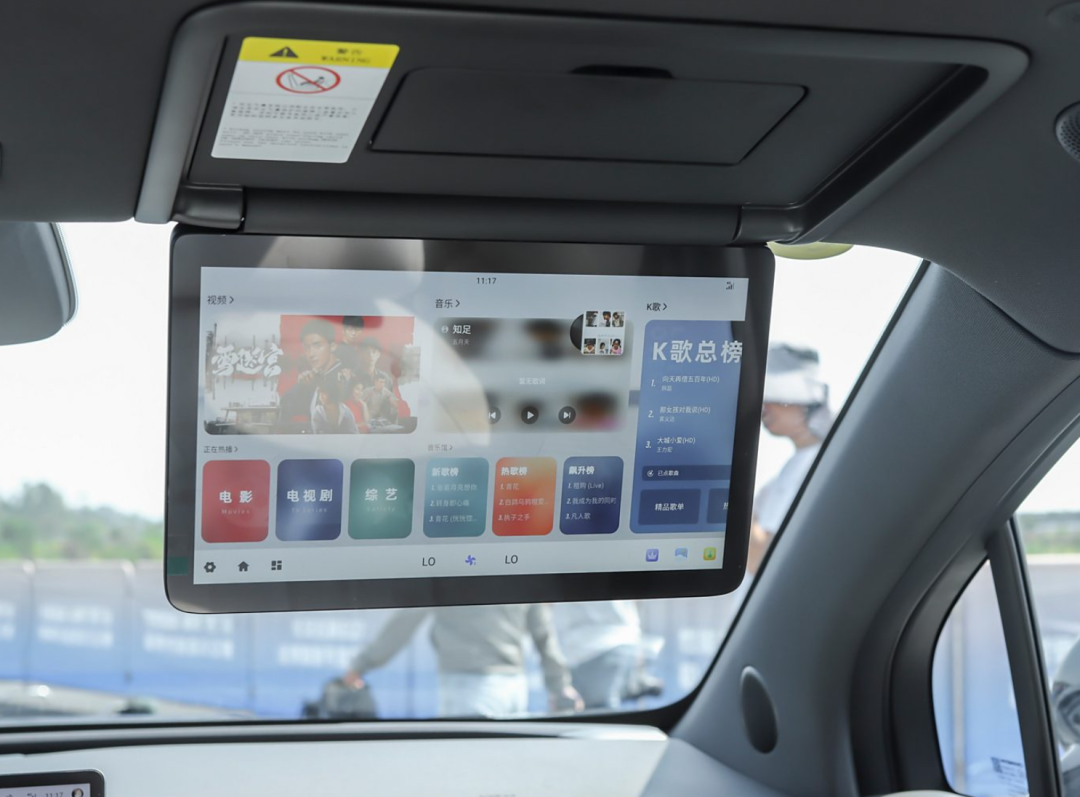沒有儀表但全系都給了 HUD ,中控屏是可變朝向角度的 “ 向日葵 ” 屏,主副駕都有可以躺下來的零重力座椅。在副駕遮陽板那裏放了一塊娛樂屏,方便躺下來刷劇,跟長安自家的深藍 S7 一個位置。