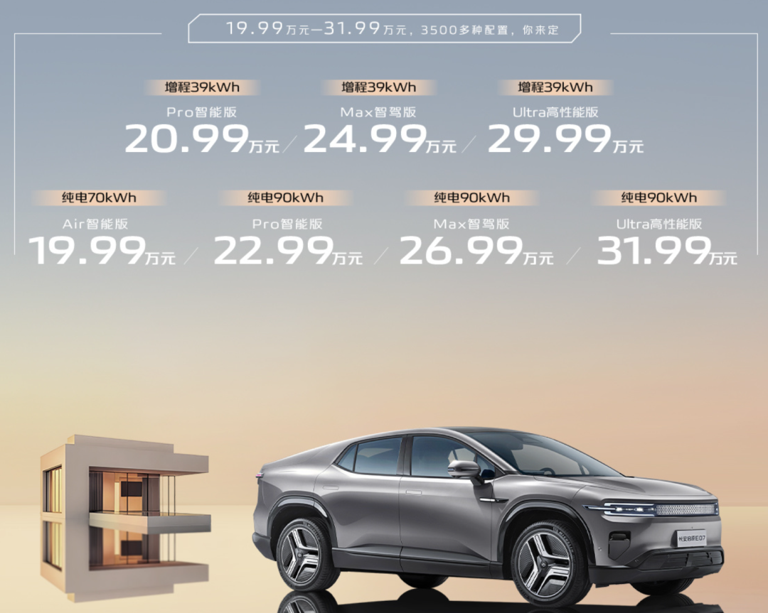看着是便宜了 5 萬,但它其實是小玩了一招。原來預售只有 3 個配置,分別是增程 Max 、純電 Max 和純電 Ultra ,這仨價格都沒動,然後補充了一些低配進來,把起售價降到 19.99 萬。