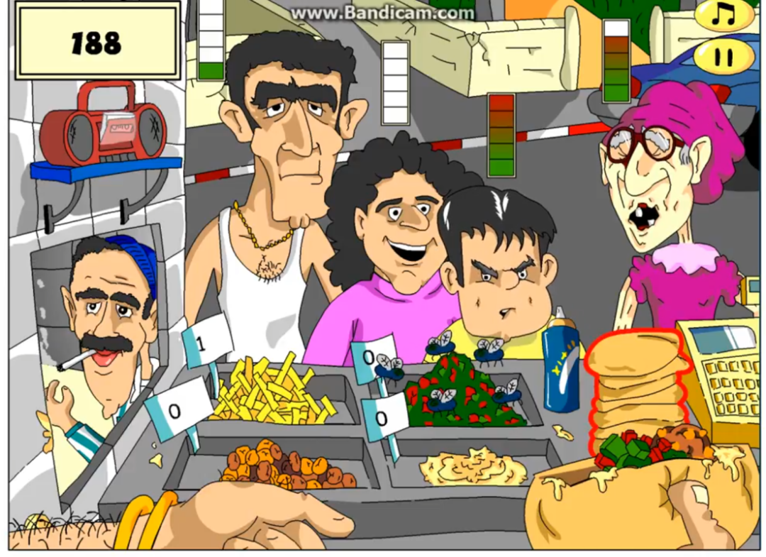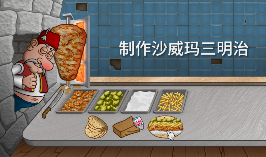 遊戲儘可能簡化了烹飪過程,但大多數步驟均需手動操作、反覆點擊或拖拽。切肉、切土豆、炸薯條、提醒紅鼻子老頭備齊其他材料,再將烤肉、黃瓜、疑似大蒜醬的白色醬料,以及薯條四種配料填入餅中——這一切起初都需要玩家親手點擊來操作。