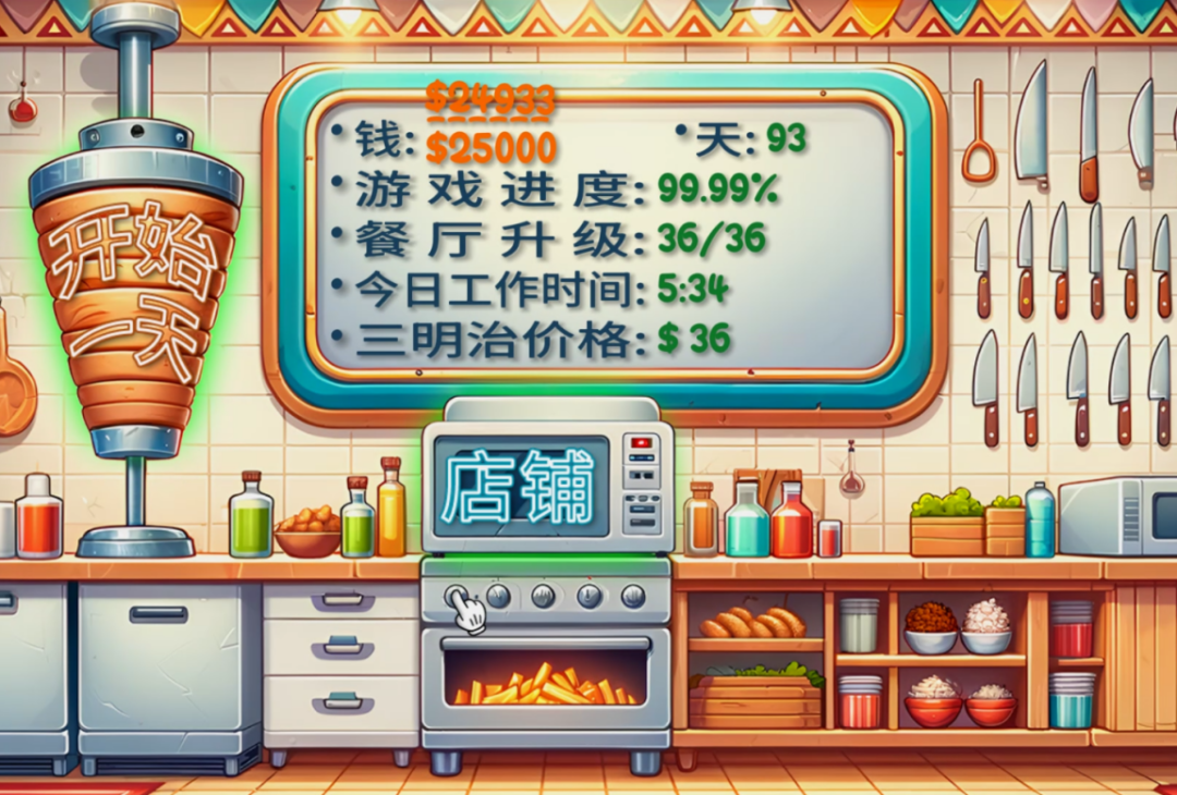 剛進遊戲,一位挺着大肚子嵌在牆裏的紅鼻子老頭,用帶着羊肉串味的普通話告訴玩家,“我不會幫你太多,我會讓你自己探索餐廳”,讓玩家先自學一遍沙威瑪捲餅的製作過程,再上幾位顧客幫助玩家反覆記憶。