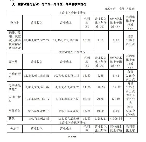 但愛瑪在轉型的步伐上已經有些落後於人。長年以來,其主要營收就是來自兩輪車,其他收入貢獻極小。以2023年財報為例,愛瑪科技電動自行車營收128.45億元,電動兩輪摩托車營收58.06億元,兩項加起來佔據總營收的88.7%。