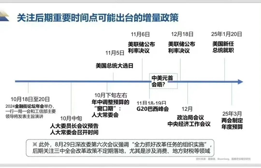 圖中把後續對市場情緒可能產生重大影響的事件以及時間軸標出:**其中,10月下旬人大常委會會議是財政預算調整的關鍵窗口。**我認為,大幅增加赤字以保證財政支出的增加力度沒有懸念,這對資本市場是強刺激。
