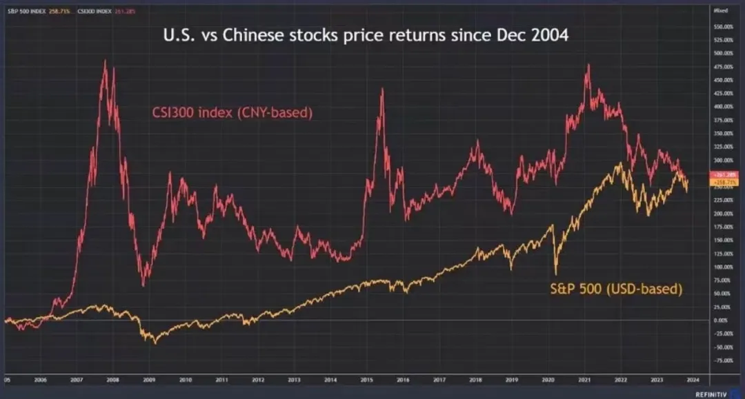 圖為我國加入WTO以來,代表A股市場表現的滬深300指數與代表美股市場的標普500指數兩者長期走勢比較。