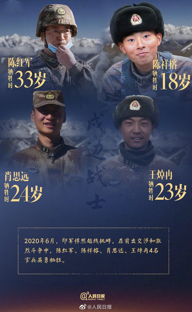 2020年6月15日晚,吃了熊心豹子膽的600印軍竟不顧警告,悍然越線挑釁,就這樣,一場大戰就在加勒萬河谷展開。我們80名戰士絲毫不畏懼,跟敵人整整肉搏了8小時,最終造成我方陳紅軍、陳祥榕、肖思遠、王焯冉4名官兵犧牲,團長祁發寶重傷,印方也聲稱有20人死亡。