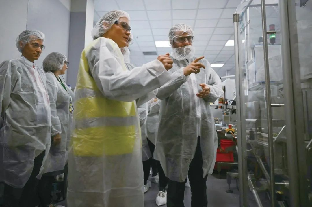 ▲ 10月14日,法國經濟部長阿爾芒(右)在法國北部利雪(Lisieux)一家生產多利潘的工廠視察。(法新社圖)
